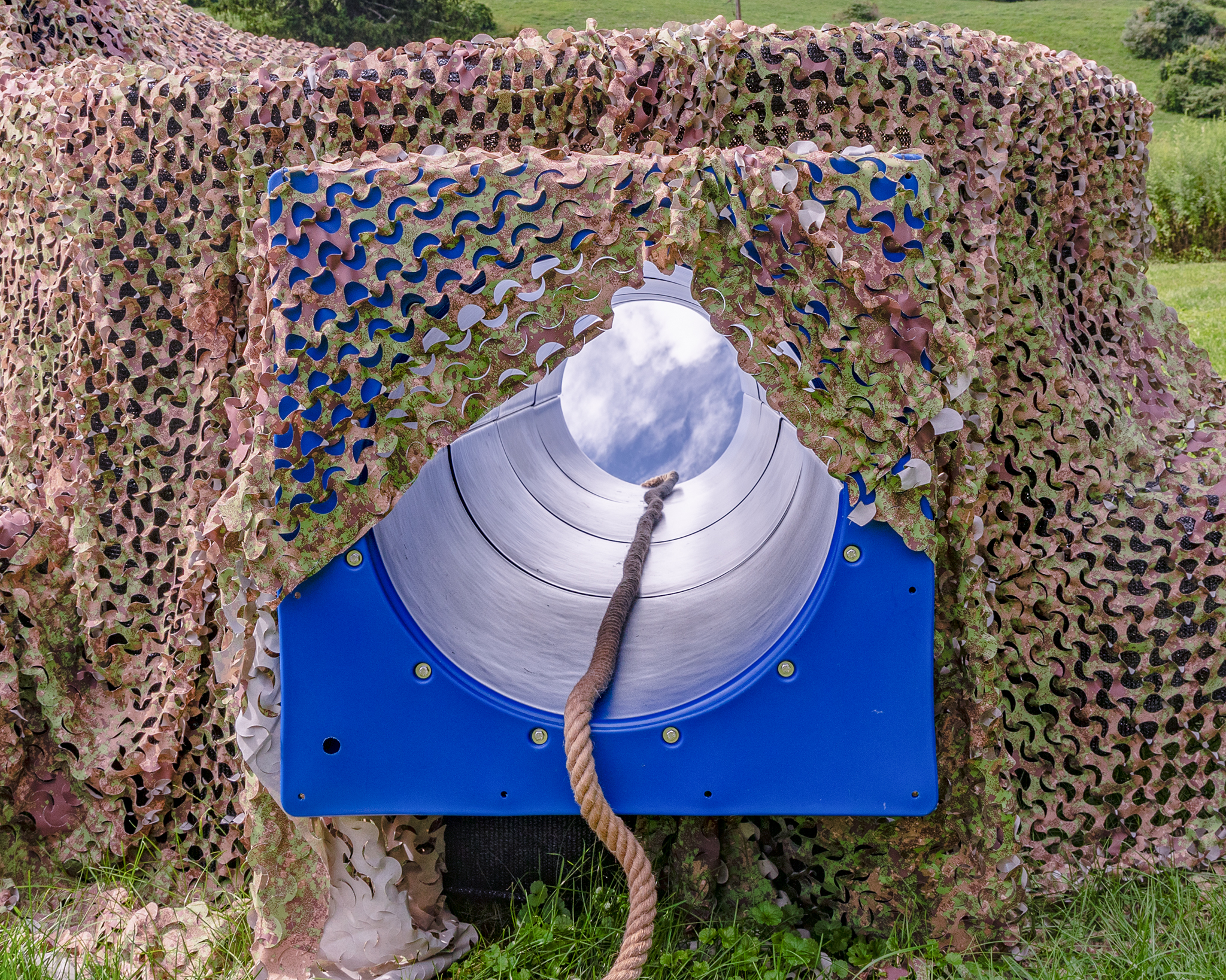 Camouflage netting, fencing wire, playground tunnel, rope, mirror, deer decoy, paint, lumber, waterproof paper.
